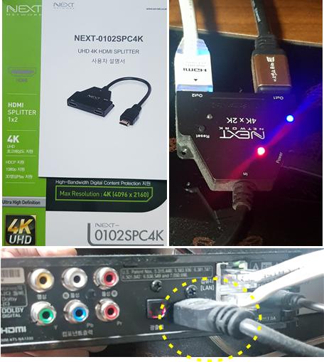 문제는 셋탑박스(KT 쿡)에서 지원하는 HDMI 출력 단자가 1개밖에 없어서 TV와 빔프로젝터 두 개를 연결하기엔 부족하여 분배기가 필요합니다.
