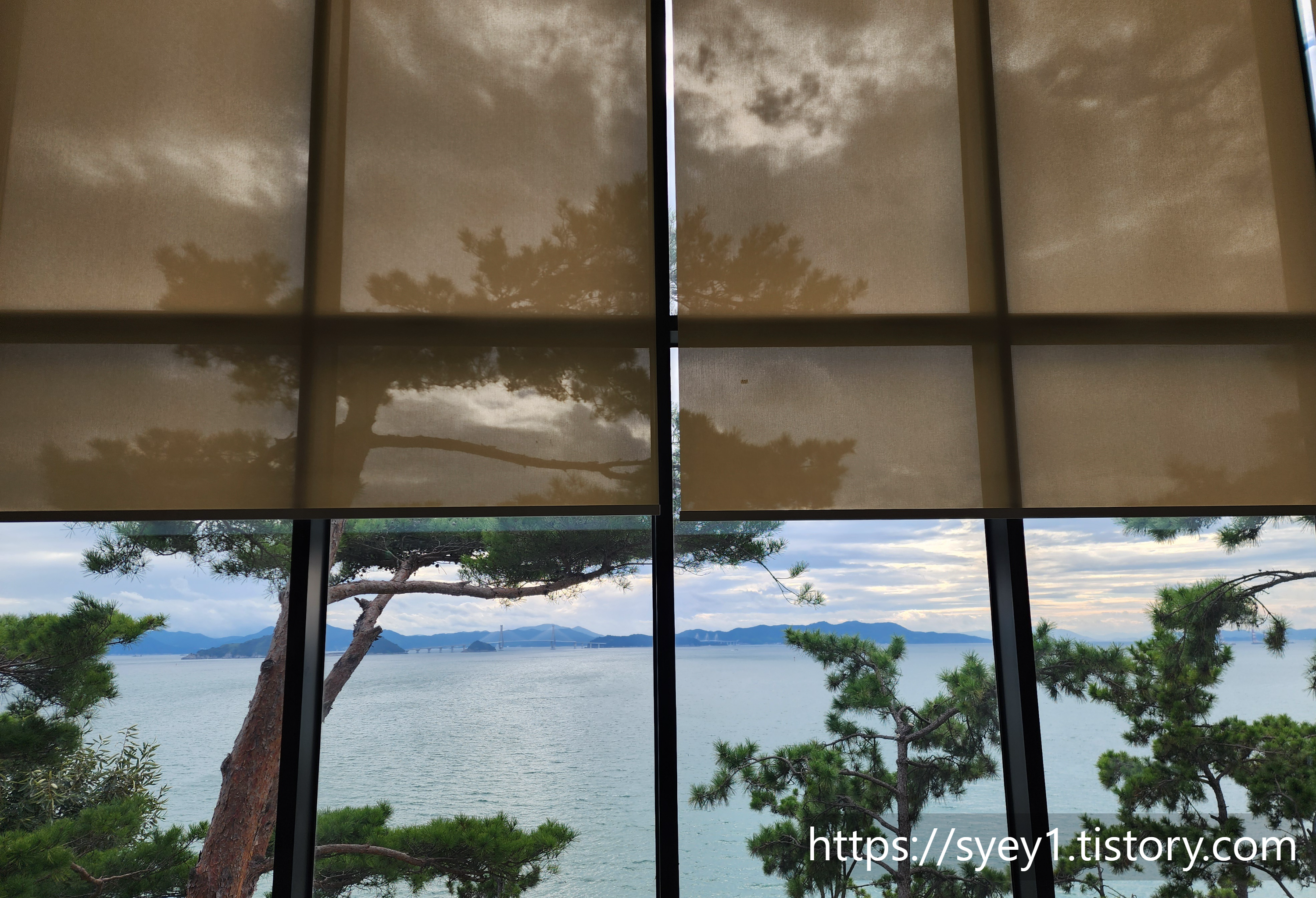 우리는 실내에서 거가대교를 바라보며